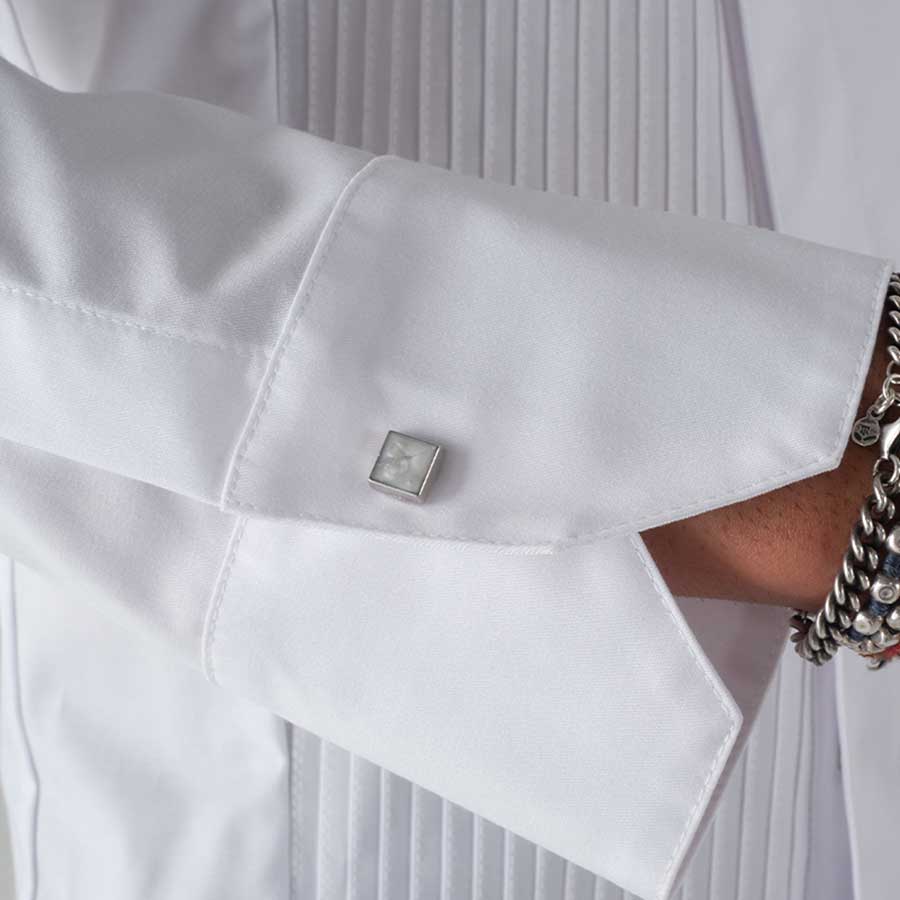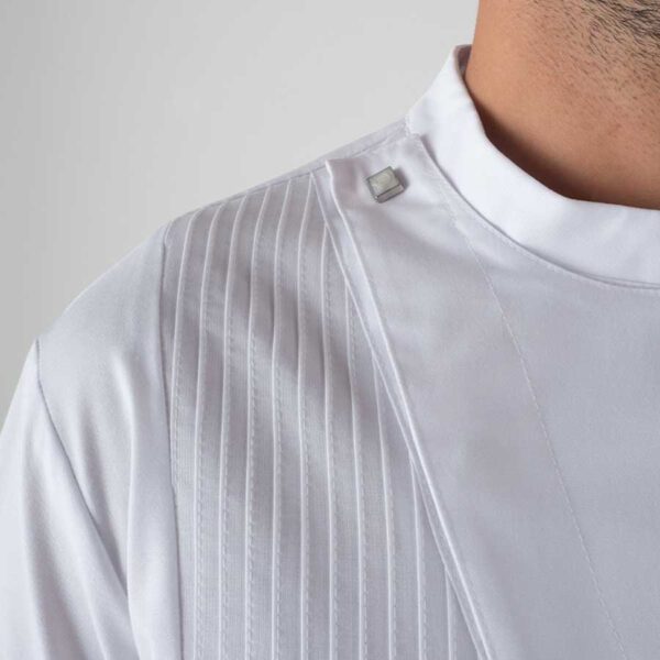 100% Made in Italy, realizzata in TENCEL™ elasticizzato, tessuto pregiato ed altamente innovativo, è ricercata nello stile e nei materiali, di fattura eccellente e curata in ogni dettaglio. Presenta bottoni intercambiabili ed è impreziosita da una elegante plisettatura in stile smoking.