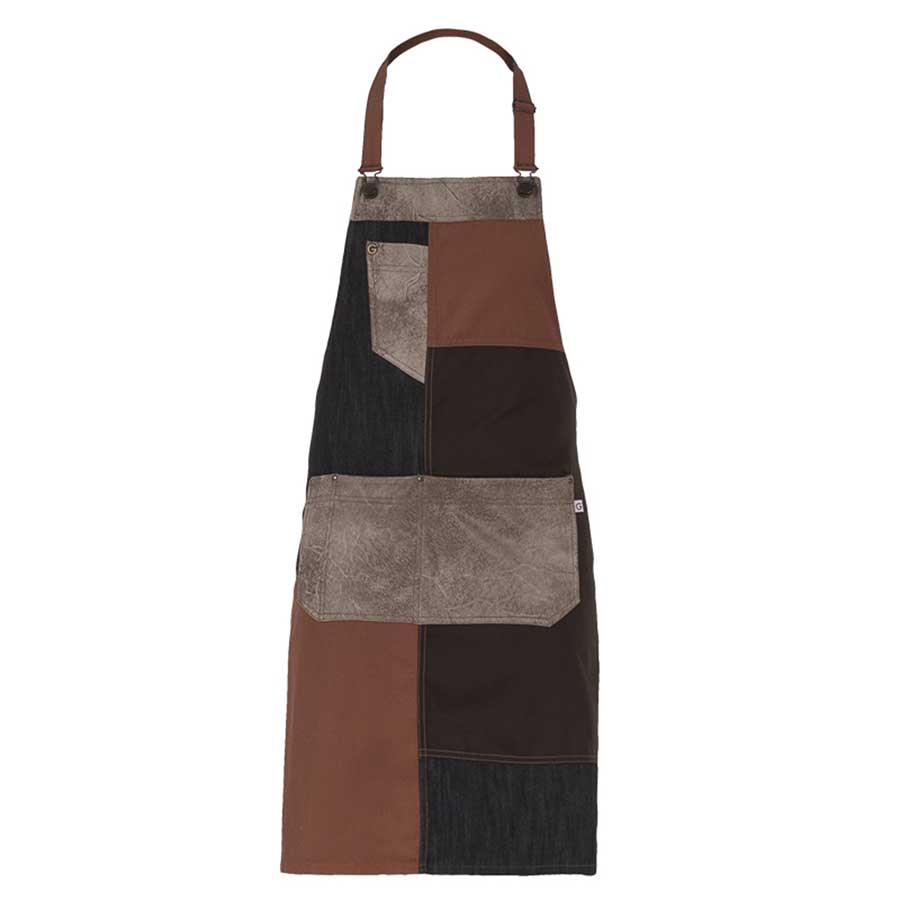 Il grembiule da lavoro California in stile patchwork si rinnova dopo il grande successo delle versioni in denim delle stagioni precedenti. Conservando la tipica allacciatura salopette con tracolla regolabile, le due tasche e il taschino portapenne, la nuova variante presenta tonalità molto calde con colori che richiamano la terra, in un mix che spazia dal nero jeans al coccio, passando per toni moka molto intensi. Le tasche in alcantara arricchiscono lo stile innovativo di questo grembiule conferendogli un aspetto vissuto e in linea con le tendenze contemporanee. A completare il tutto, le doppie cuciture a contrasto e la galvanica in ottone invecchiato regalano luminosità e ricercatezza ad un capo versatile ma ricco di personalità.