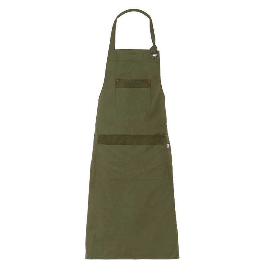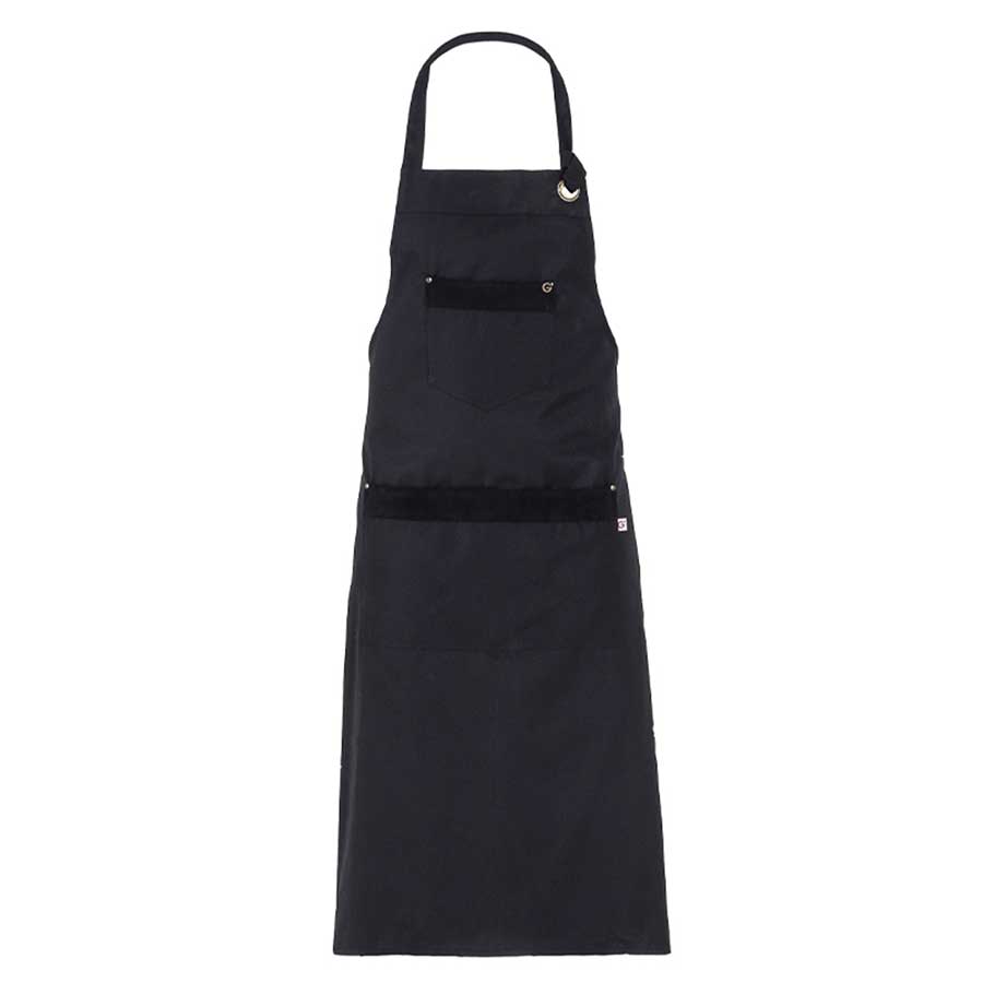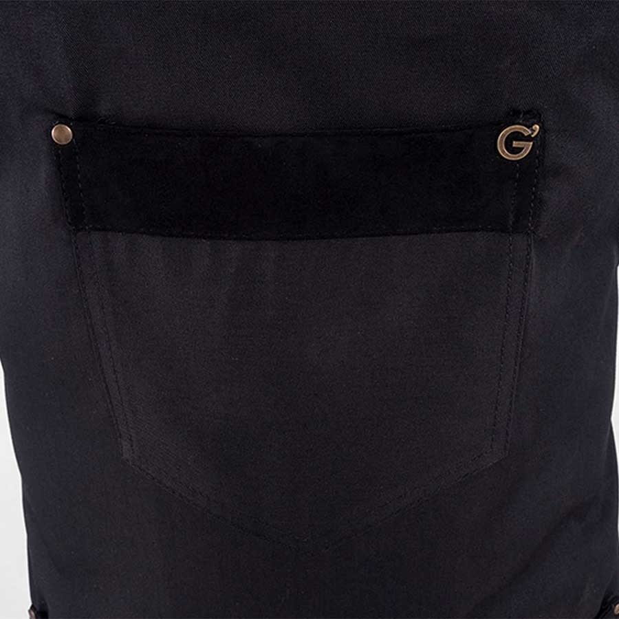 Il grembiule con pettorina Ryan, moderno e di sicuro effetto estetico, unisce essenzialità e cura dei dettagli in un unico capo. Questo grembiule da lavoro dalle dimensioni ampie ha una allacciatura regolabile mediante una vela in ottone anticato, una grande tasca centrale divisa da un’impuntura a due aghi e una tasca sul centro della pettorina. Completamente ribattuto con impunture a due aghi, è impreziosito da diversi rivetti posti come ancoraggio sulle tasche. Il materiale è un resistente poliestere misto cotone, impreziosito da inserti di alcantara in tinta. Le due versioni disponibili sono in nero o in un raffinato color verde militare, entrambe caratterizzate dall’immancabile logo “G’” in ottone, che contribuisce ad illuminare il capo.