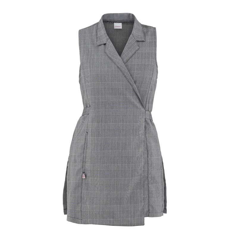 Lo scamiciato Allegra è un capo ideale e trasversale, che ben si adatta sia al lavoro in sala che nel settore wellness; è proposto nel disegno principe di Galles dalla tonalità neutra che spazia tra bianco, nero e grigio, ed è realizzato in un tessuto tinto in filo di poliviscosa elasticizzato e stabilizzato, di media grammatura. È un capo smanicato, con chiusura ad incrocio con asola nel fianco, regolabile con lacci. Presenta il collo a rever classico, una tasca sul lato destro ed impunture in tinta a riva.